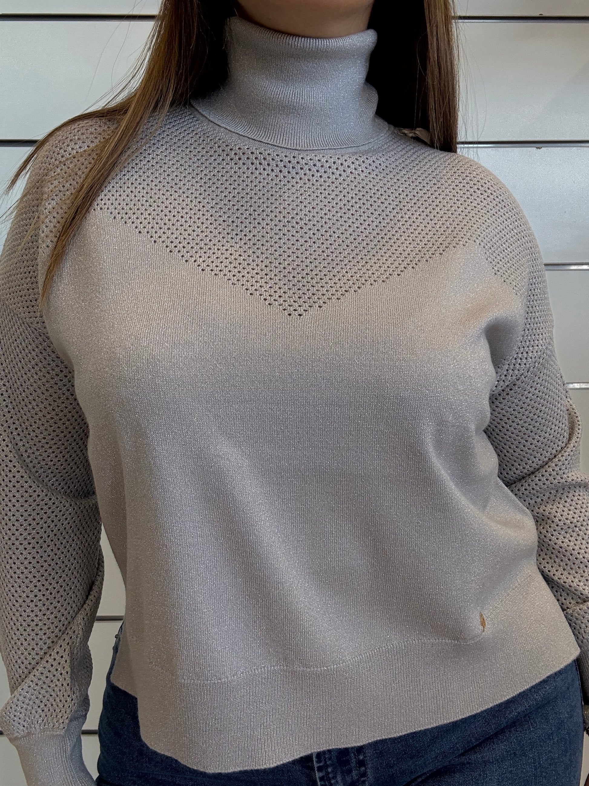 Scegli la dolcevita in filato di misto viscosa e lurex con lavorazione punzonata. Un capo raffinato e scintillante per un look rilassato.
