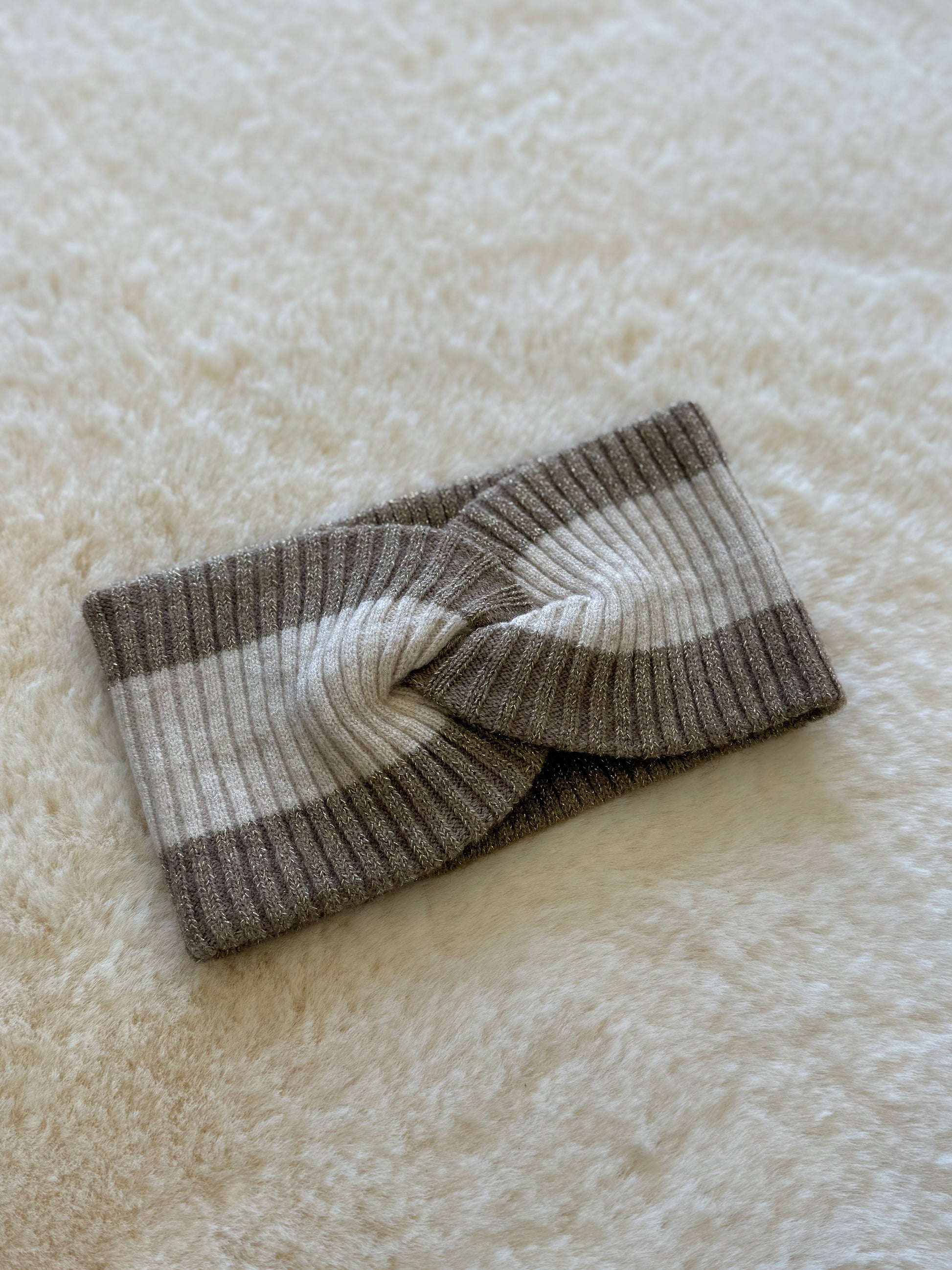 Ideale come alternativa al cappello, avvolge le orecchie mantenendole al caldo e gira completamente intorno alla testa. Il design incrociato sulla fronte e le righe nei toni panna e beige aggiungono un tocco elegante e moderno ai tuoi look invernali.