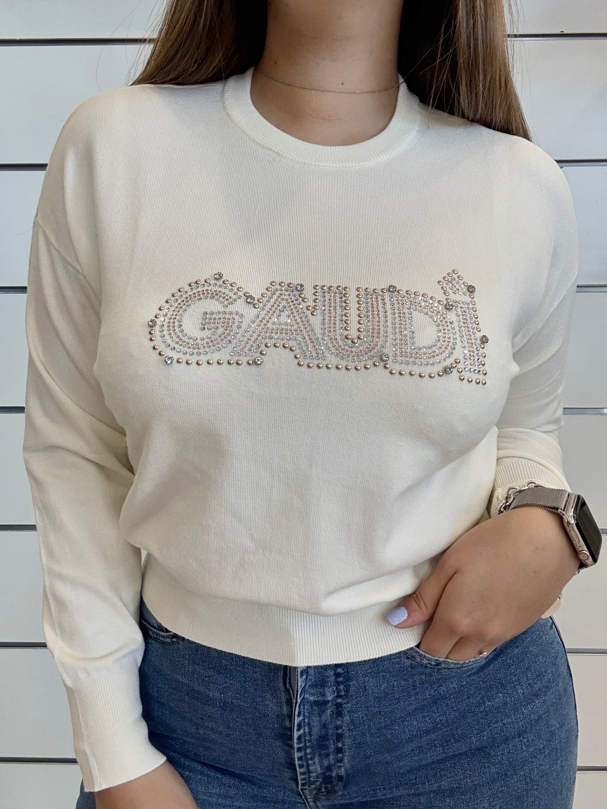 Scegli la maglia in morbido filato di misto viscosa con logo e strass sul davanti. Un capo morbido e raffinato per un outfit distintivo e moderno.
