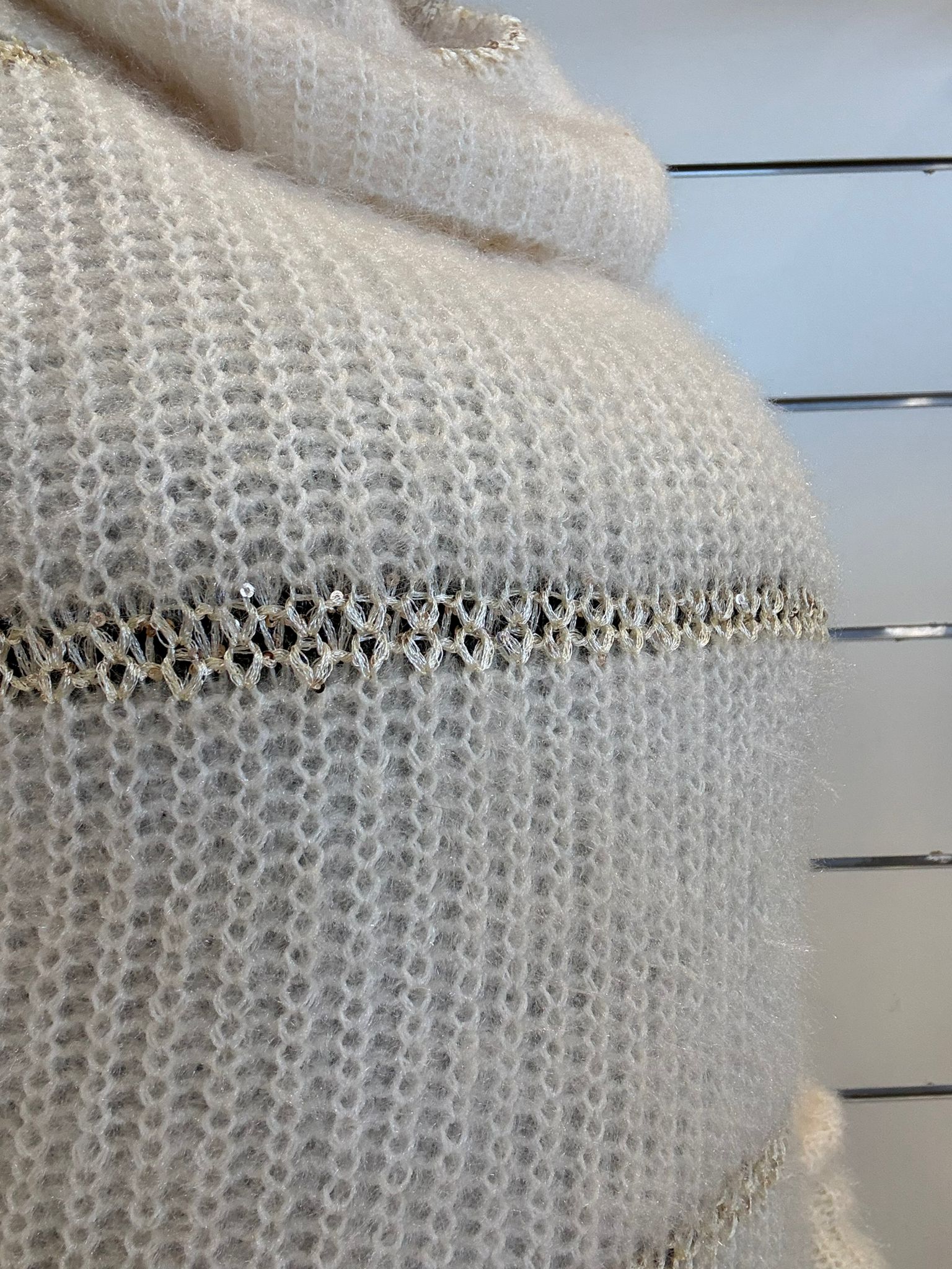 Morbido maglione lavorato a maglia con collo ampio e dettagli di paillettes dorate sulle righe, per un tocco luminoso e femminile. Realizzato in 100% poliestere, unisce comfort e stile elegante.
