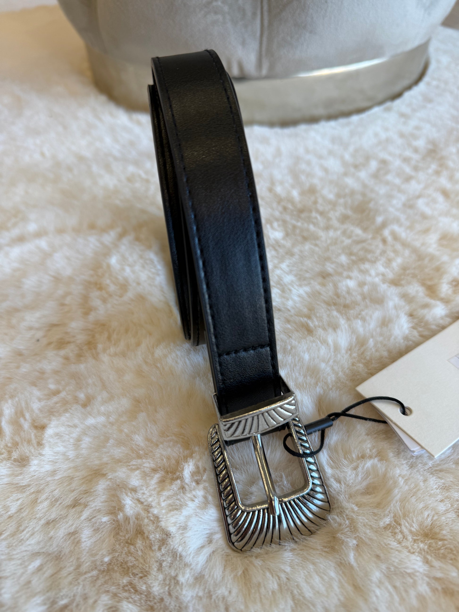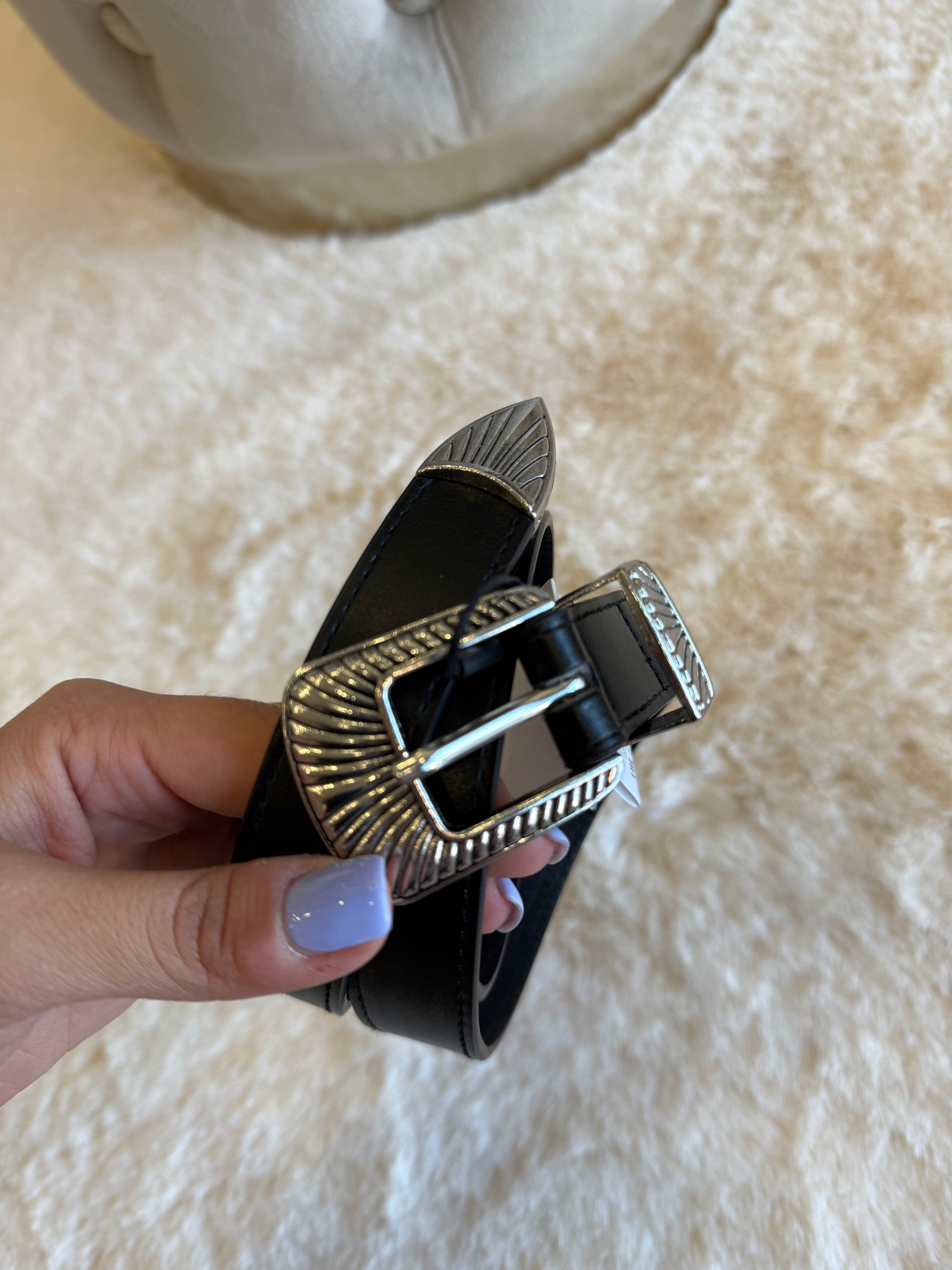 Cintura in ecopelle nera dal design grintoso ed elegante, impreziosita da fibbia argentata lavorata e puntale coordinata. Un accessorio iconico, ispirato alle mode intramontabili degli anni '90, perfetto per dare carattere a ogni look.