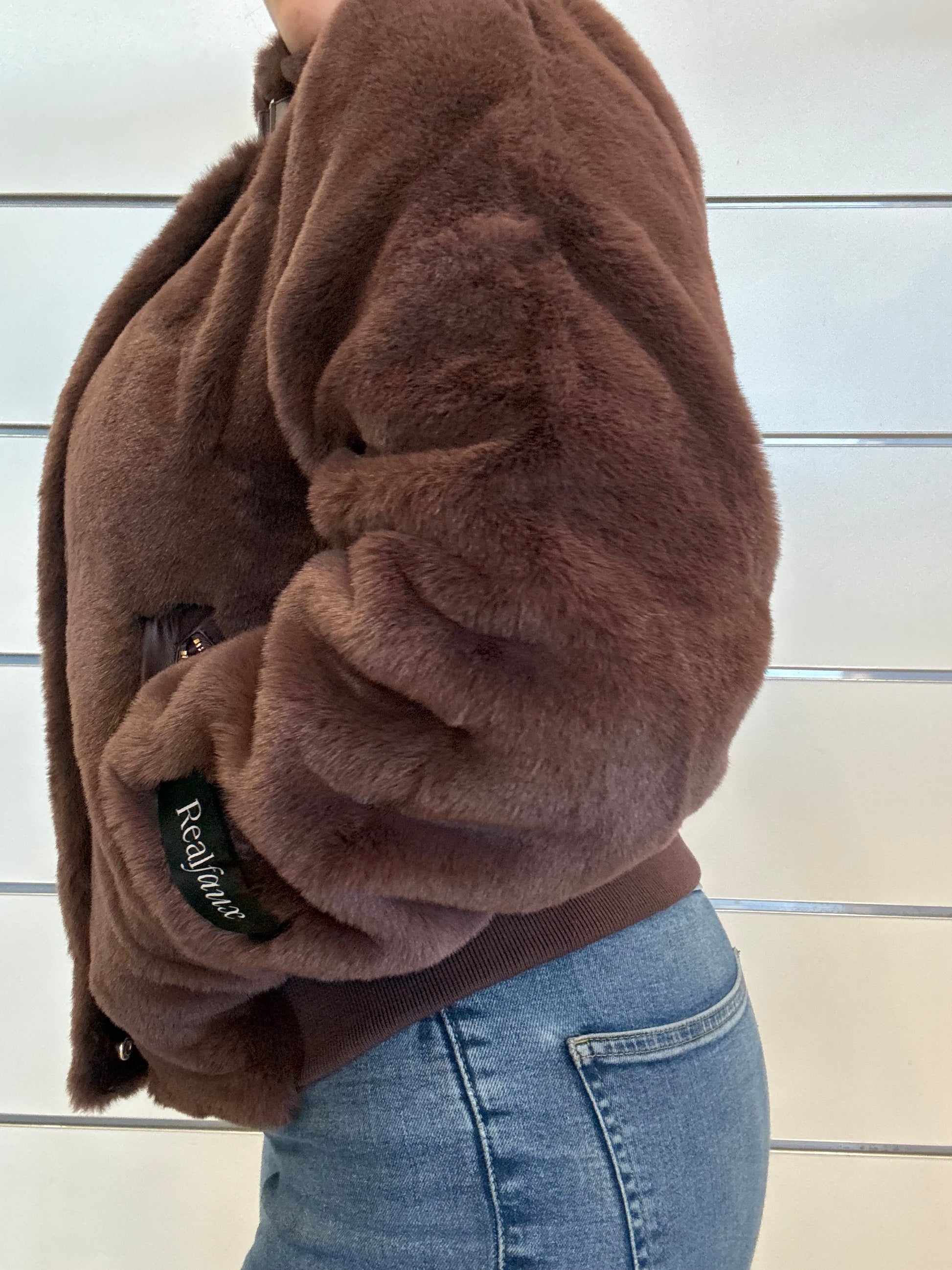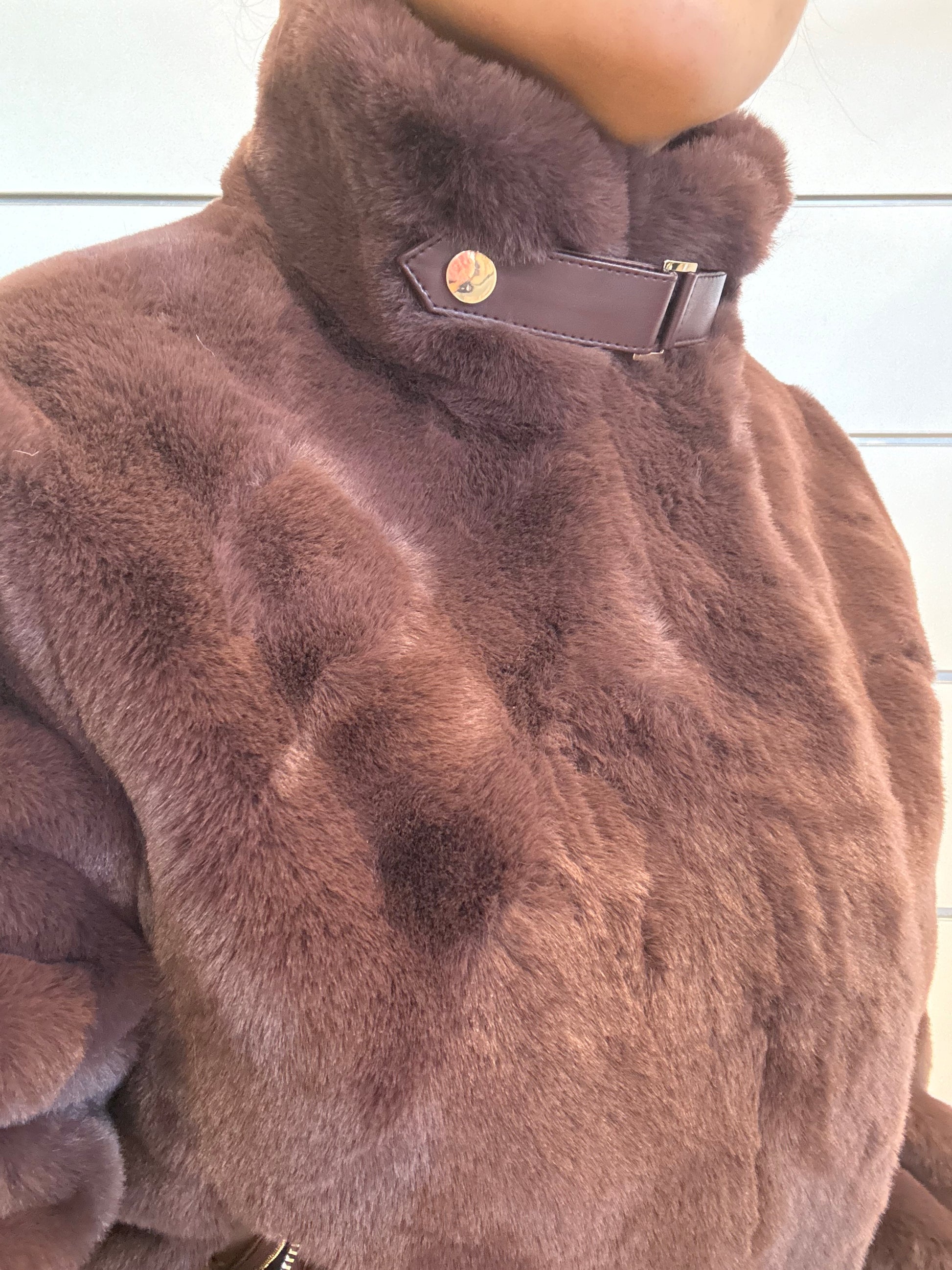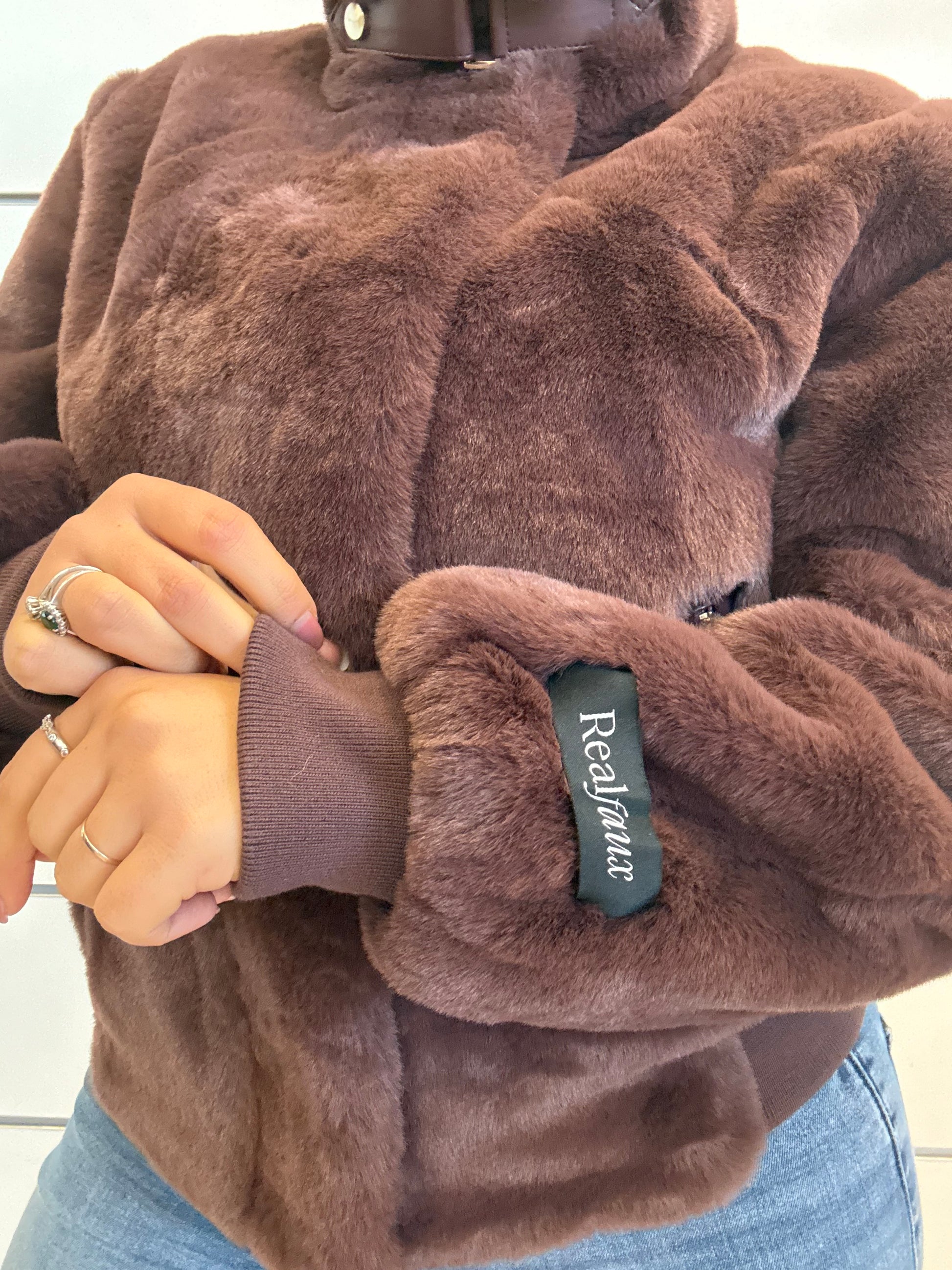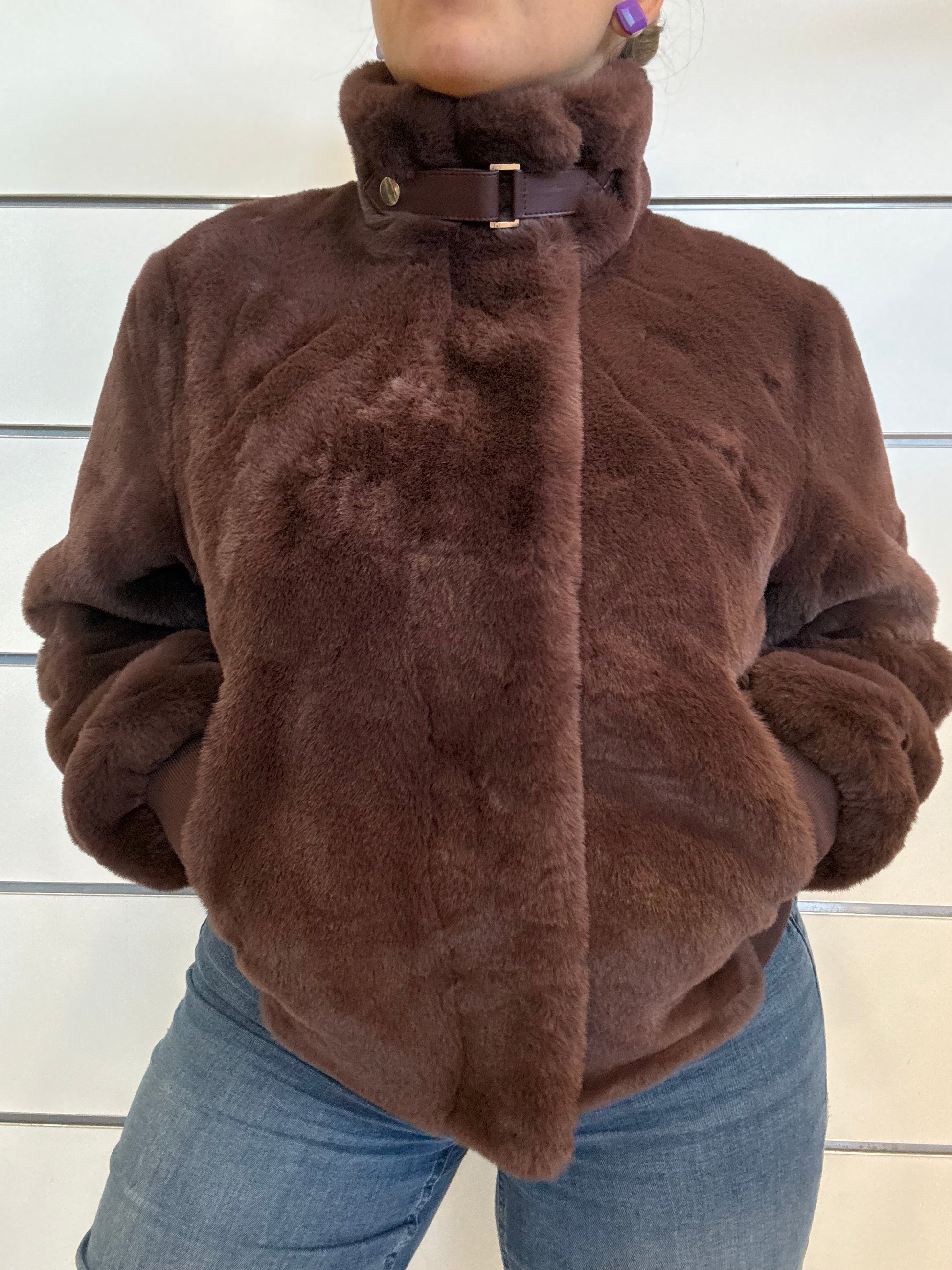 Bomber in ecopelliccia color vinaccia, caldo e morbido, realizzato in 100% poliestere. Presenta una zip coperta per un aspetto pulito e un colletto versatile, da tenere alto o ripiegato, grazie alla fibbia regolabile. Un capo moderno e avvolgente, perfetto per completare i look invernali.