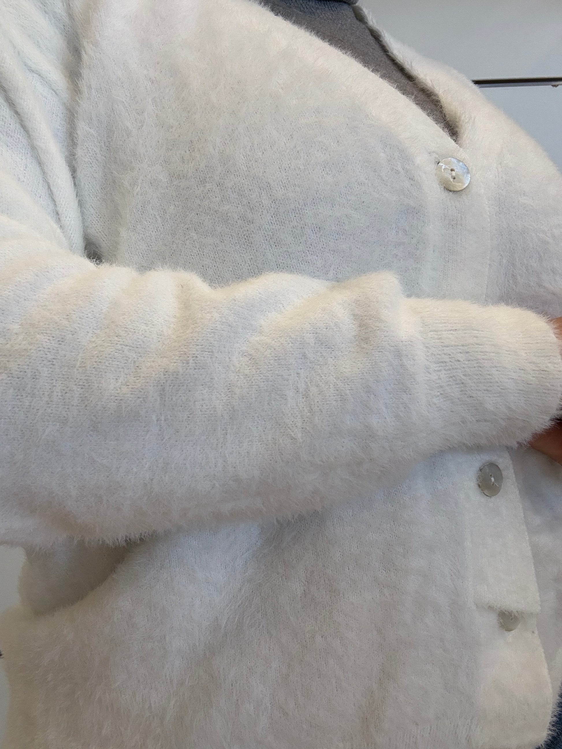 Cardigan dal tessuto leggermente “peloso”, con maniche strette e chiusura frontale a bottoncini. Realizzato in 70% nylon e 30% acrilico, offre comfort e stile delicato.