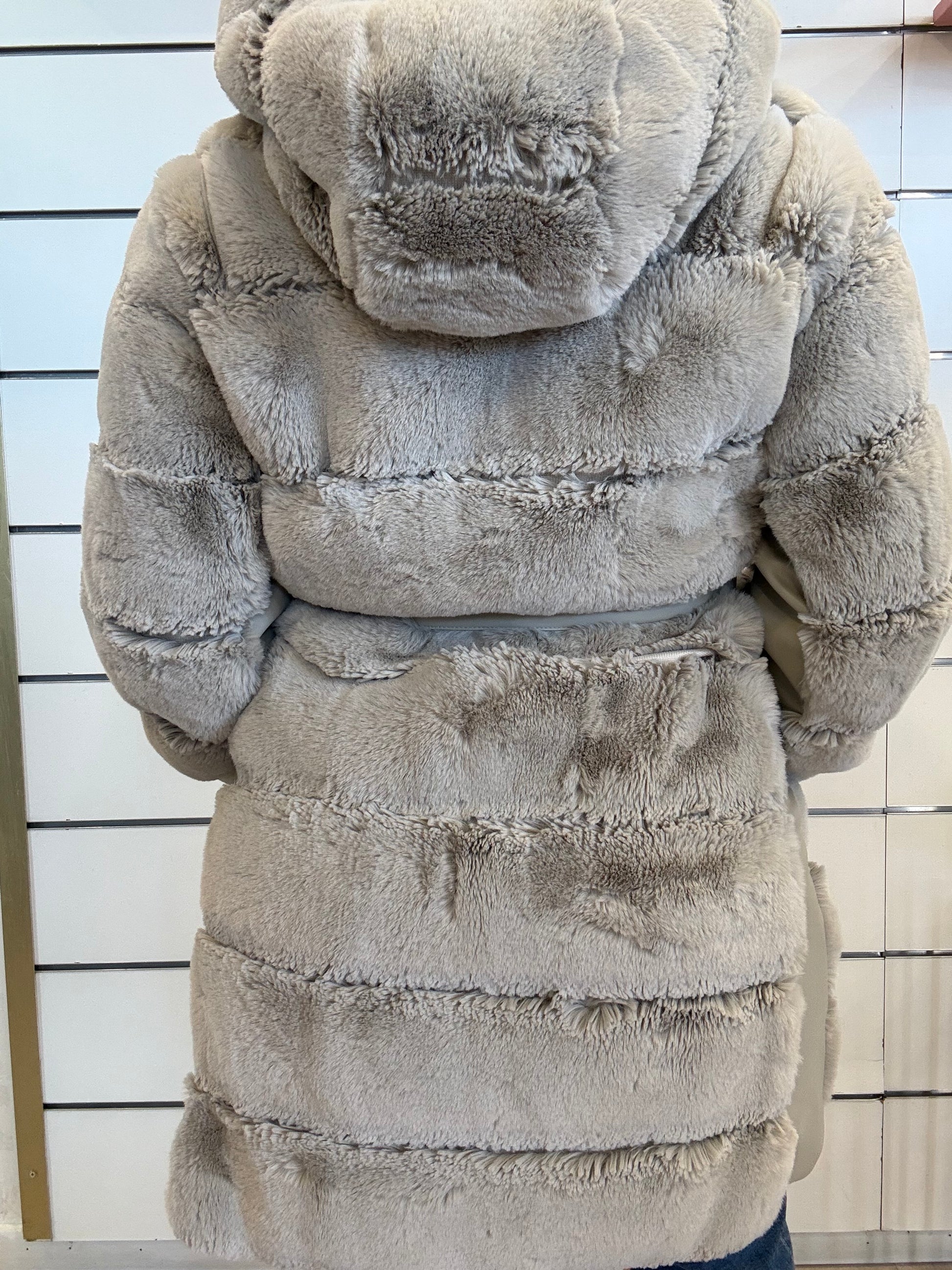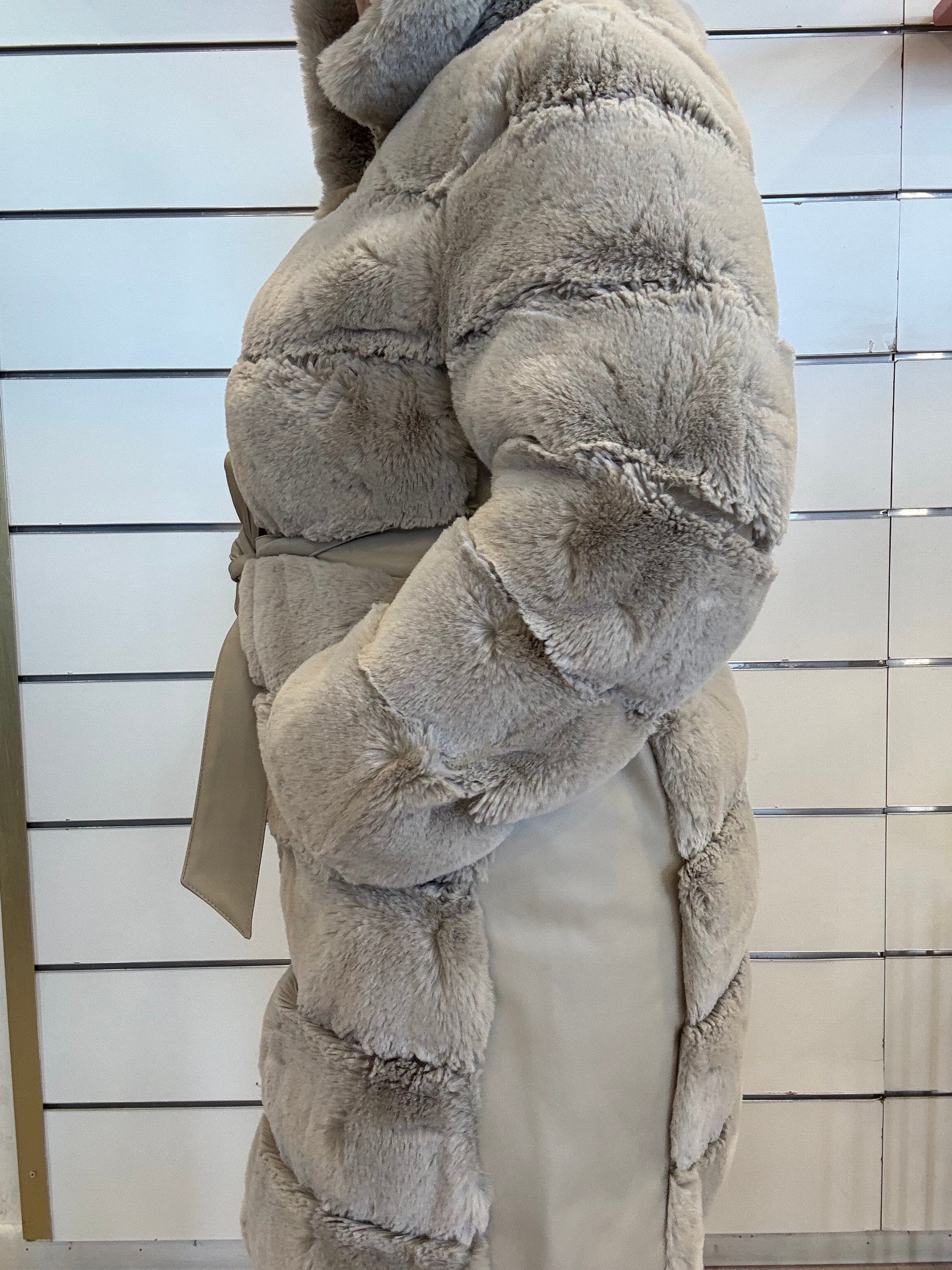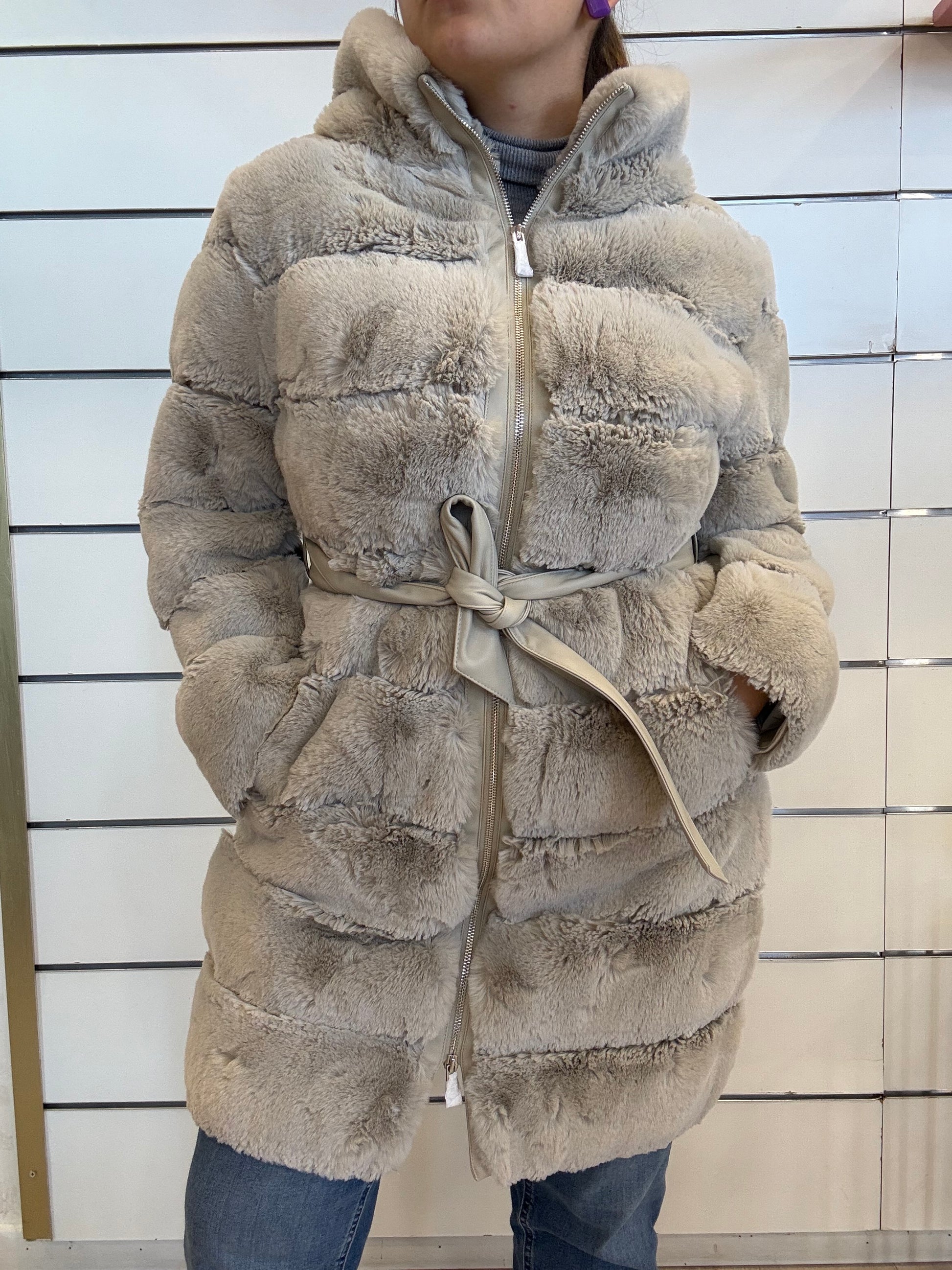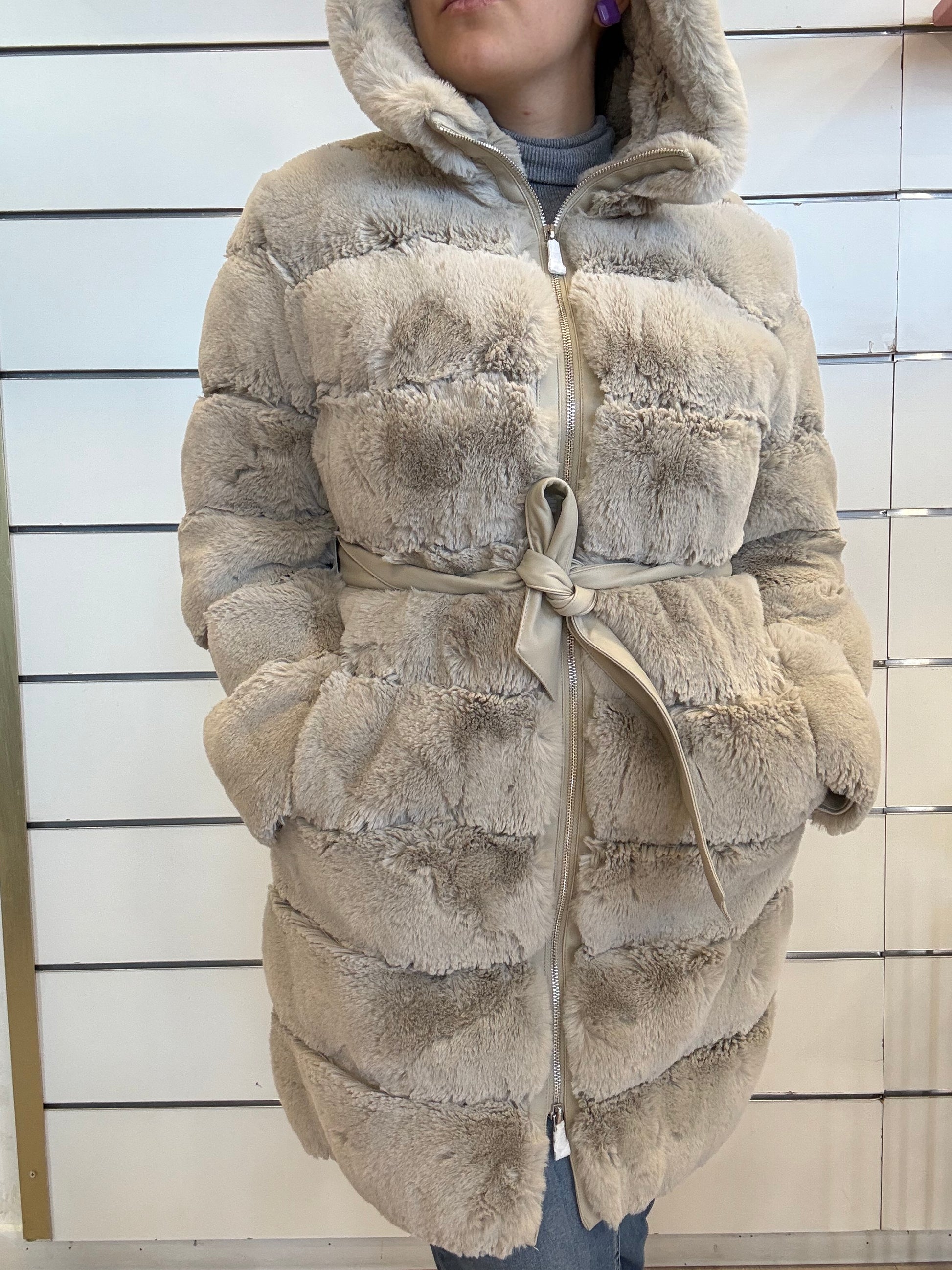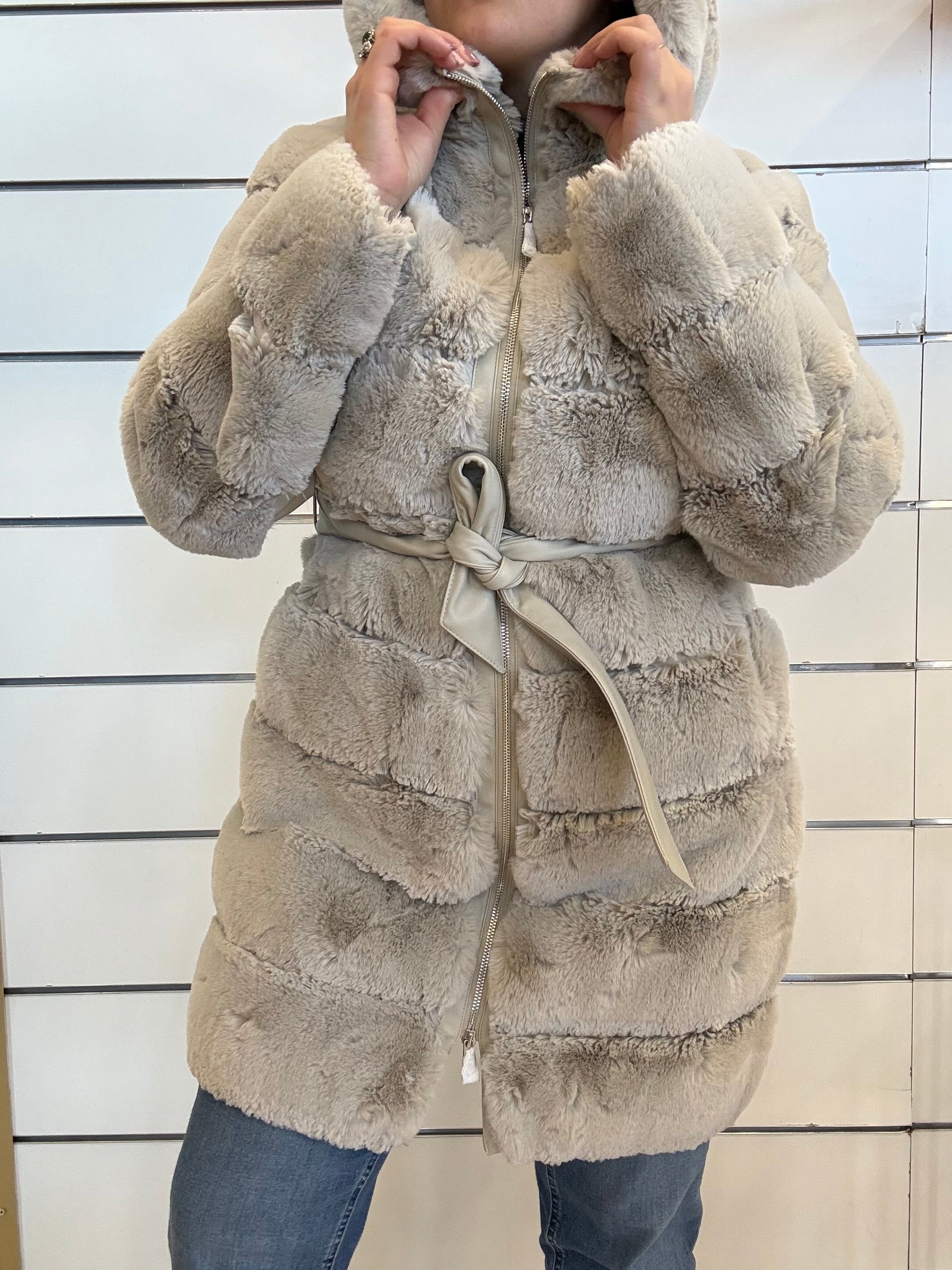 Goditi il caldo con questo morbidissimo cappotto in pelliccia sintetica con dettagli in similpelle. Questo comodo cappotto è dotato di cerniera a doppio cursore, cintura regolabile in vita e morbido cappuccio.