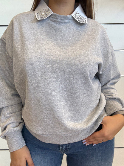 Felpa garzata grigia con colletto finta camicia removibile tramite bottoncini. Impreziosita da dettagli di brillantini argento. Realizzata in 100% cotone.