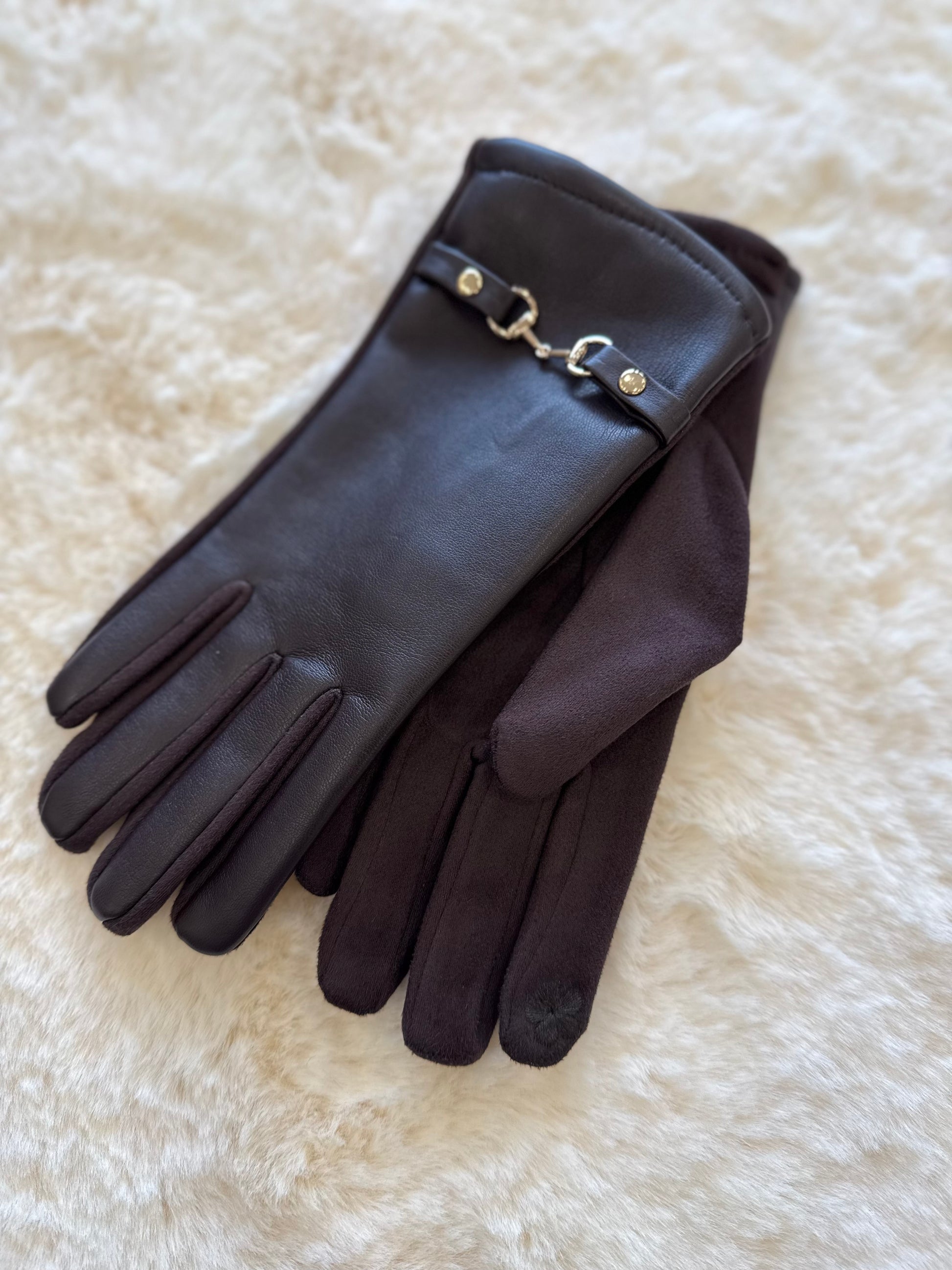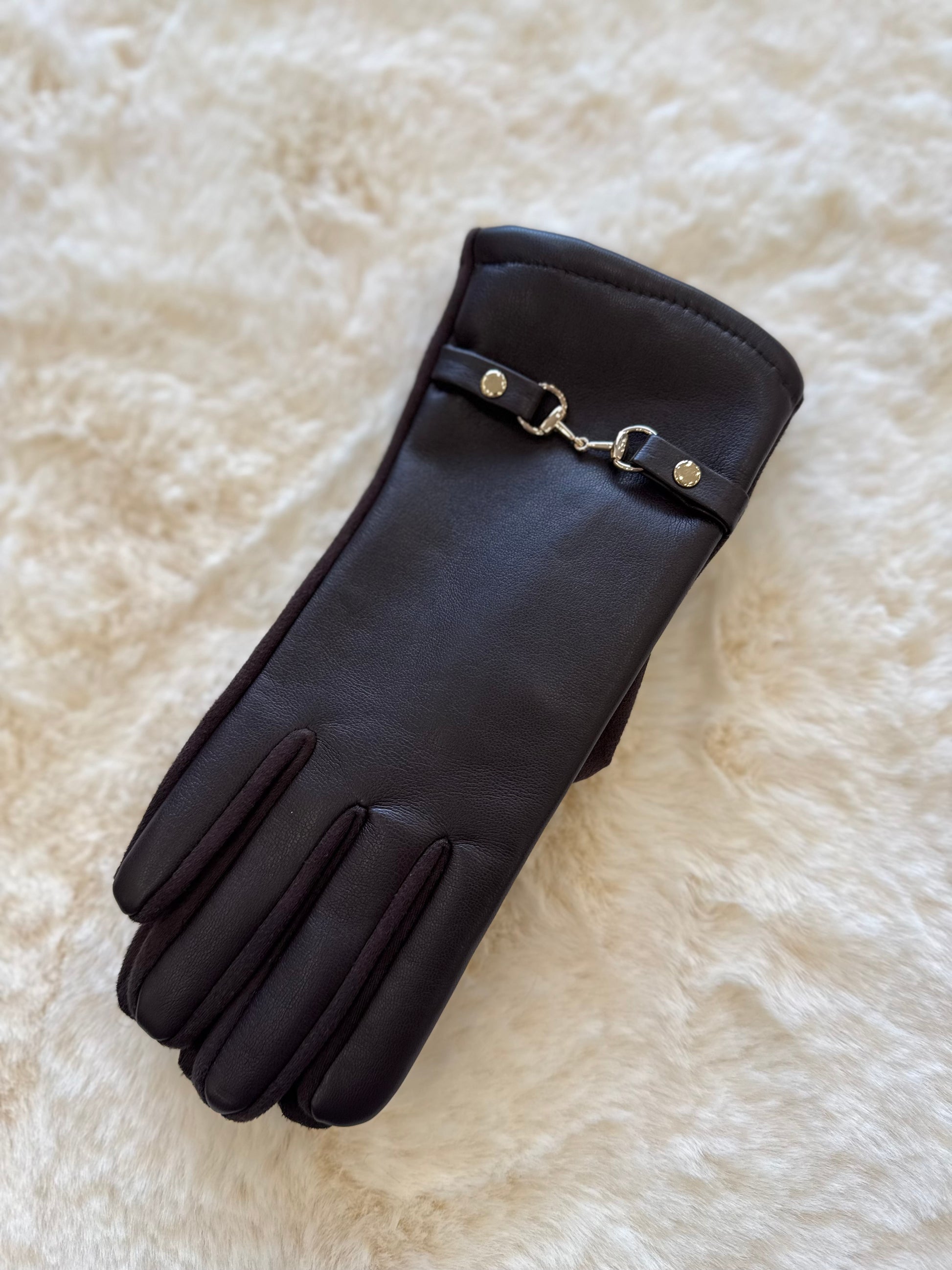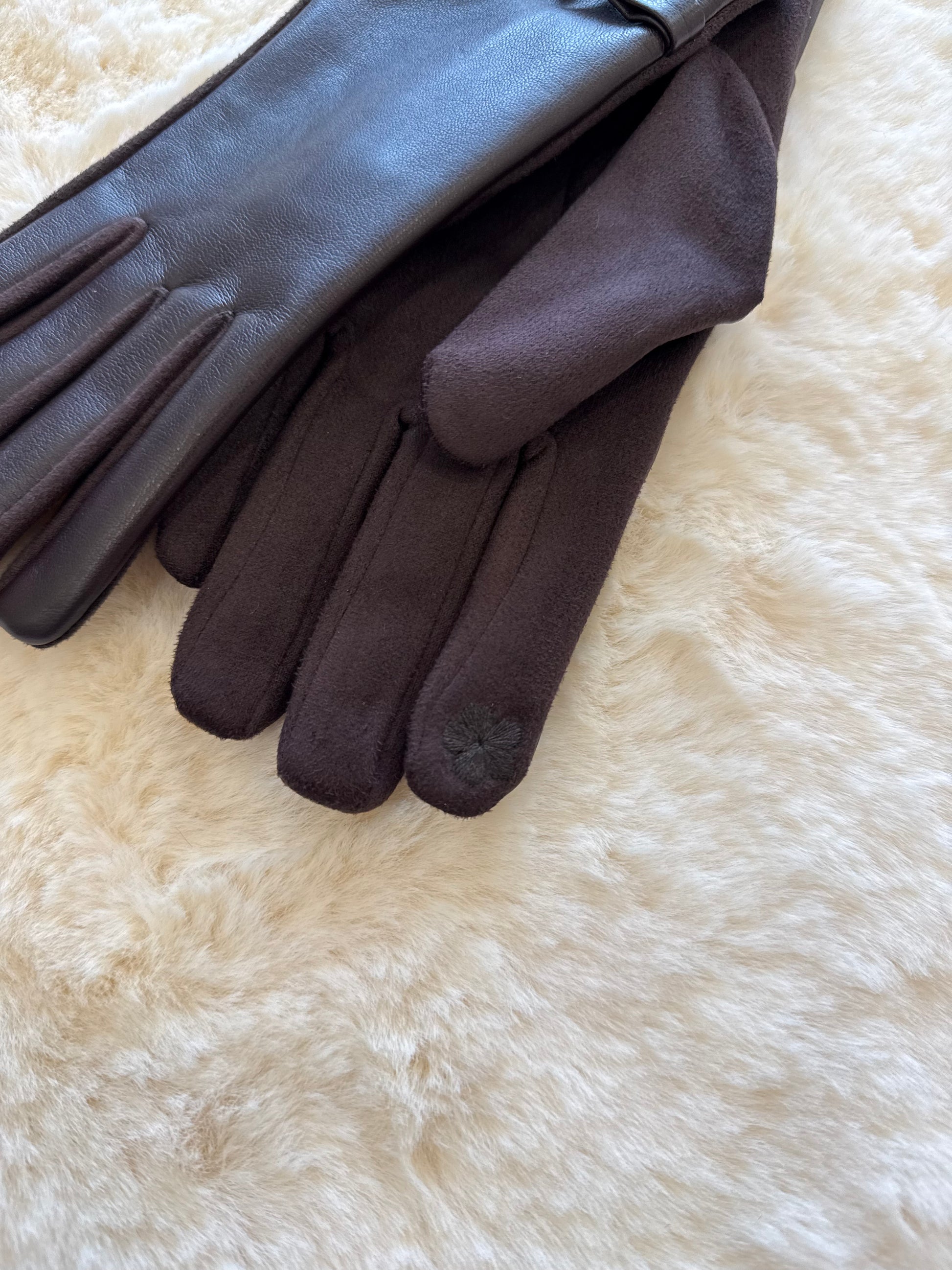 Eleganti e pratici, questi guanti touchscreen in ecopelle nera sono impreziositi da una fibbia dorata e da un delicato fiorellino sull’indice, per usare il cellulare senza toglierseli. Perfetti per unire stile e funzionalità durante l’inverno.
