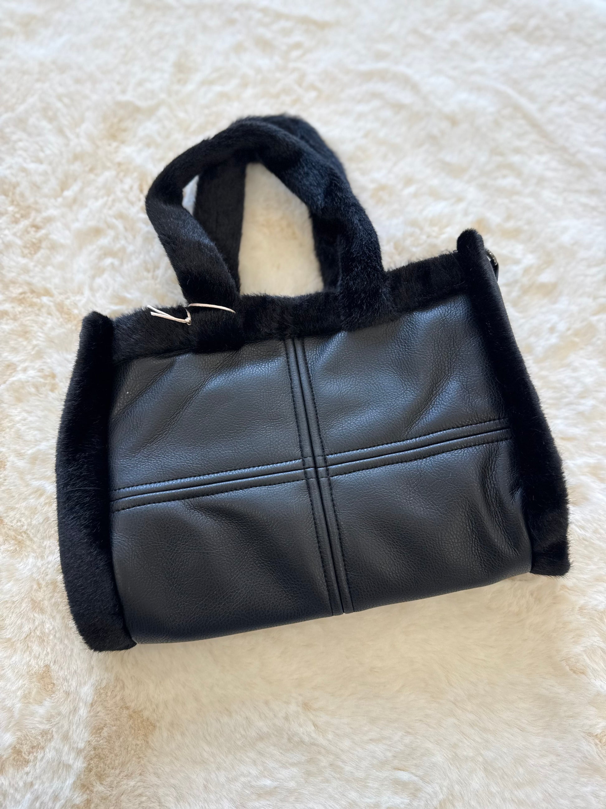 Piccola shopper in pelle vegana con dettagli in pelliccia sintetica. Questa elegante shopper presenta due manici corti, dettagli impunturati, una chiusura a scatto sulla parte superiore, una tasca interna con chiusura a cerniera e una tracolla staccabile. L'interno della borsa è realizzato in pelliccia sintetica. È la borsa perfetta per completare il tuo look e contenere tutti i tuoi oggetti essenziali.