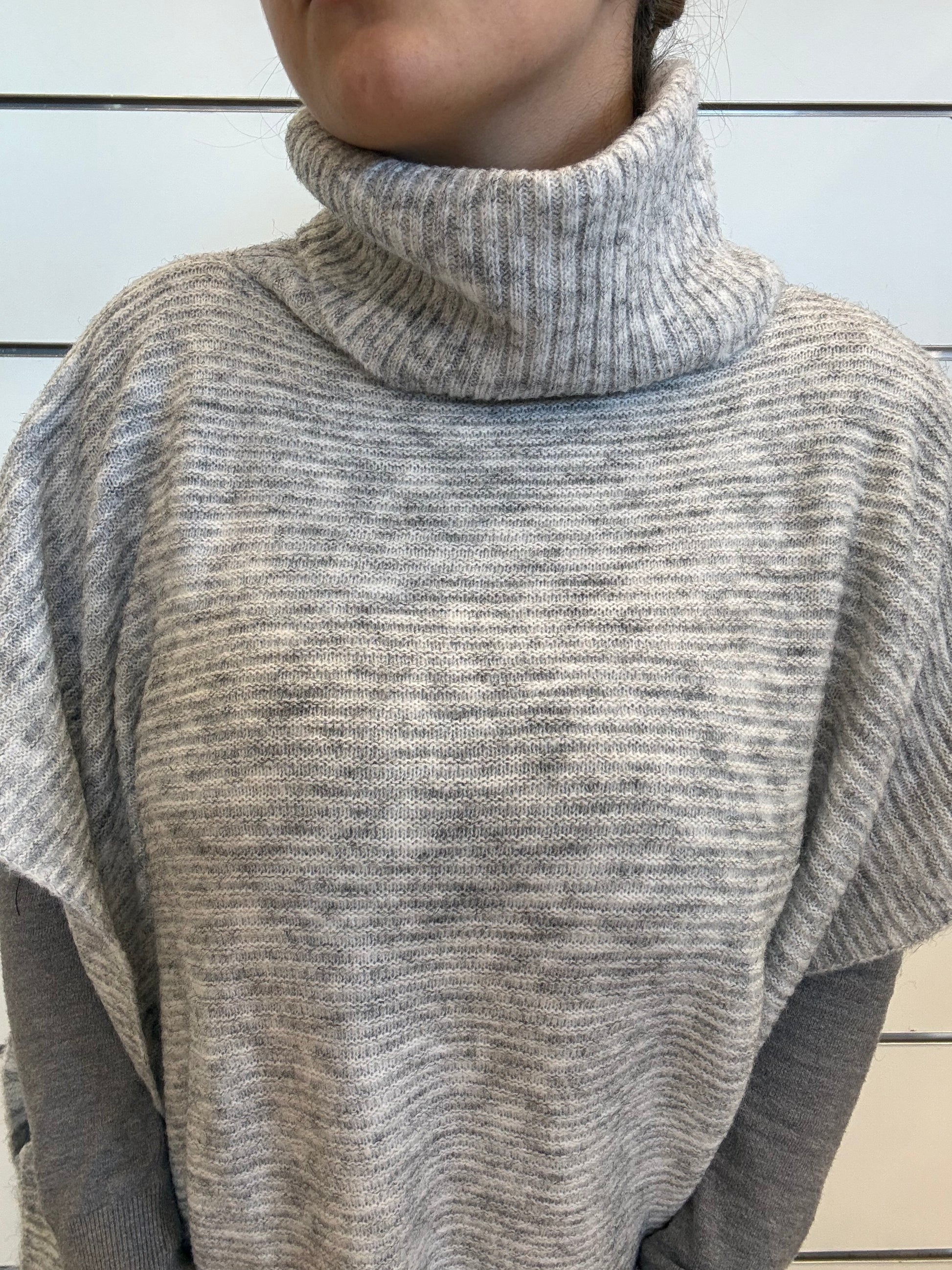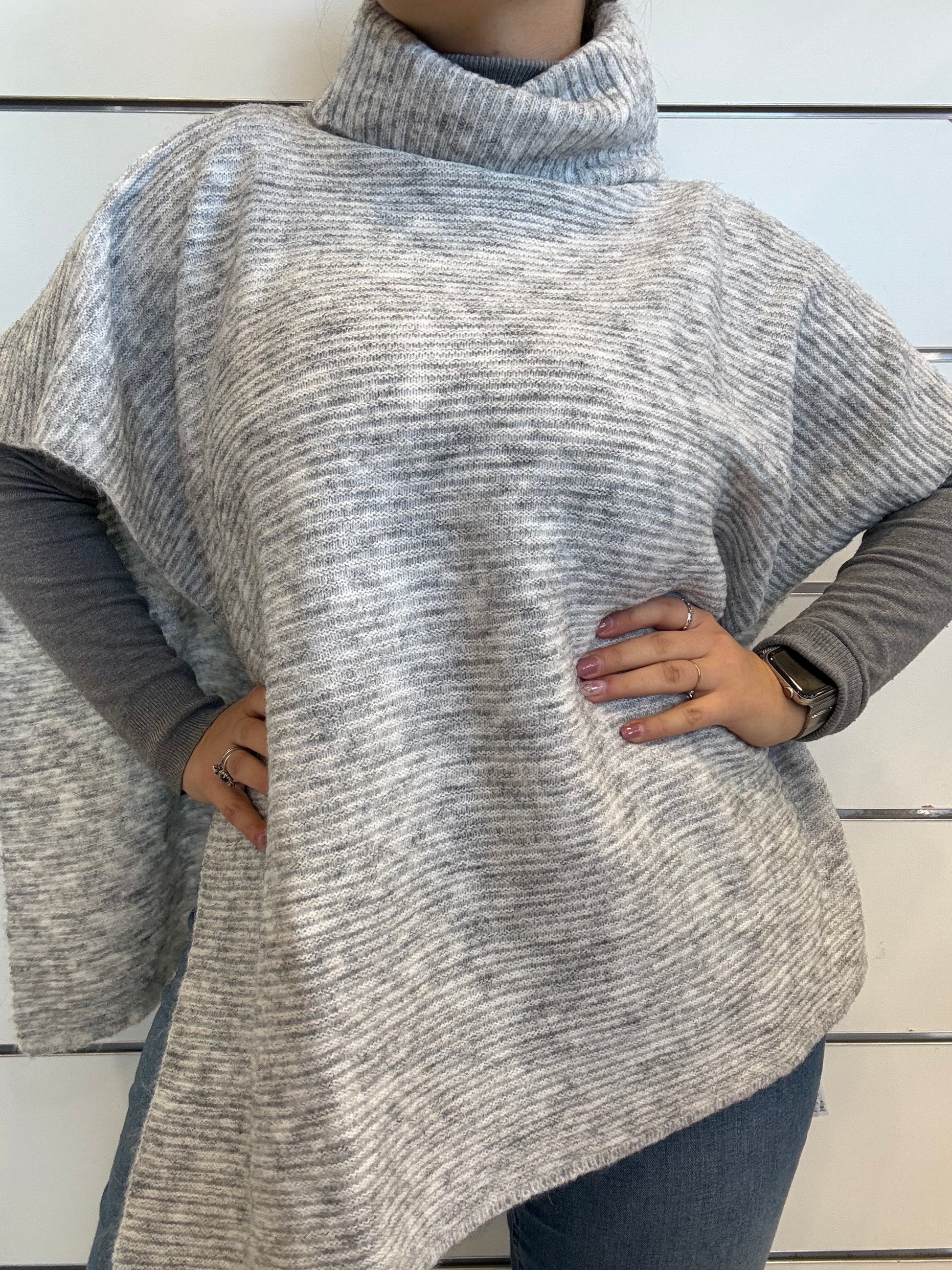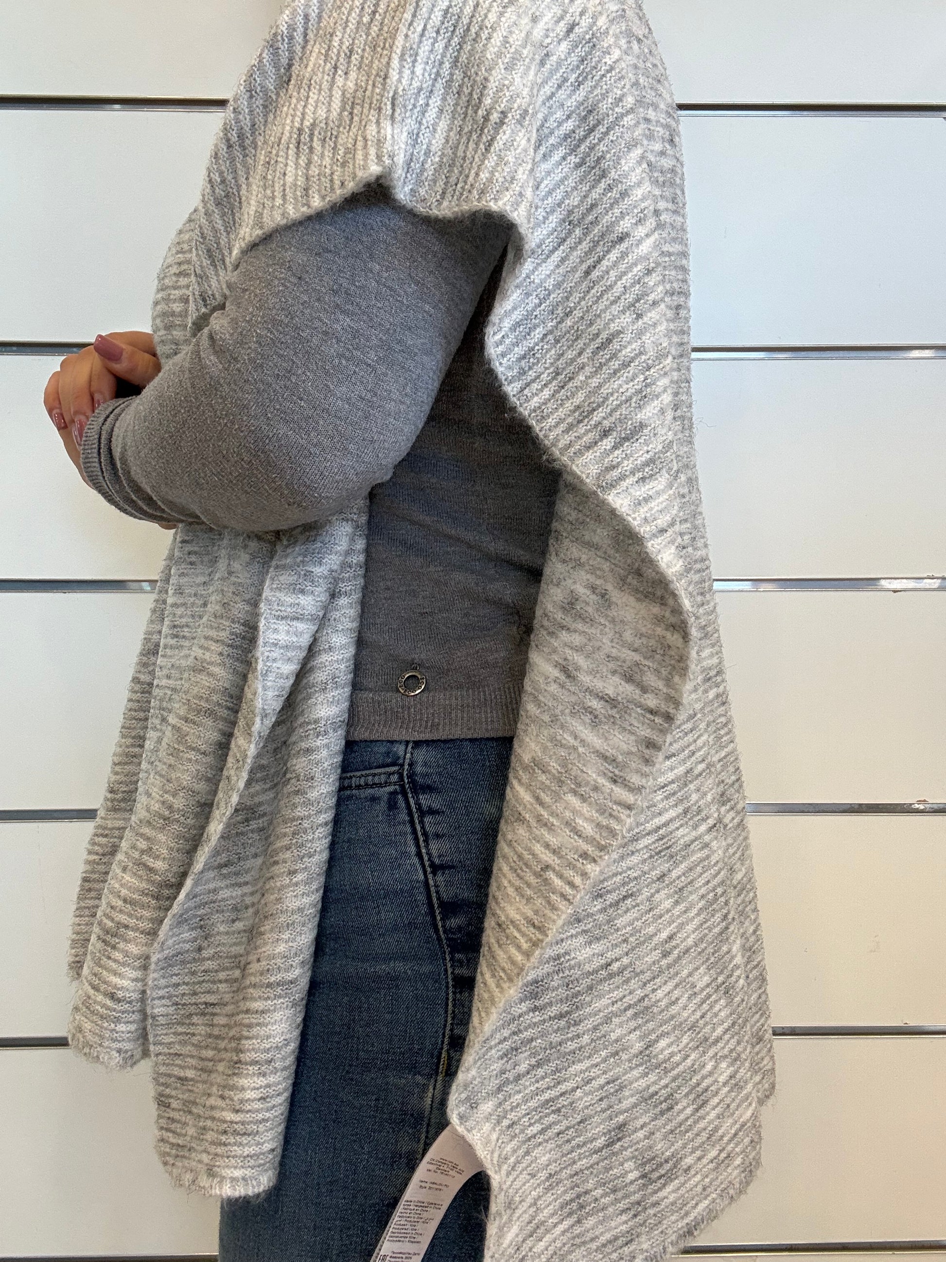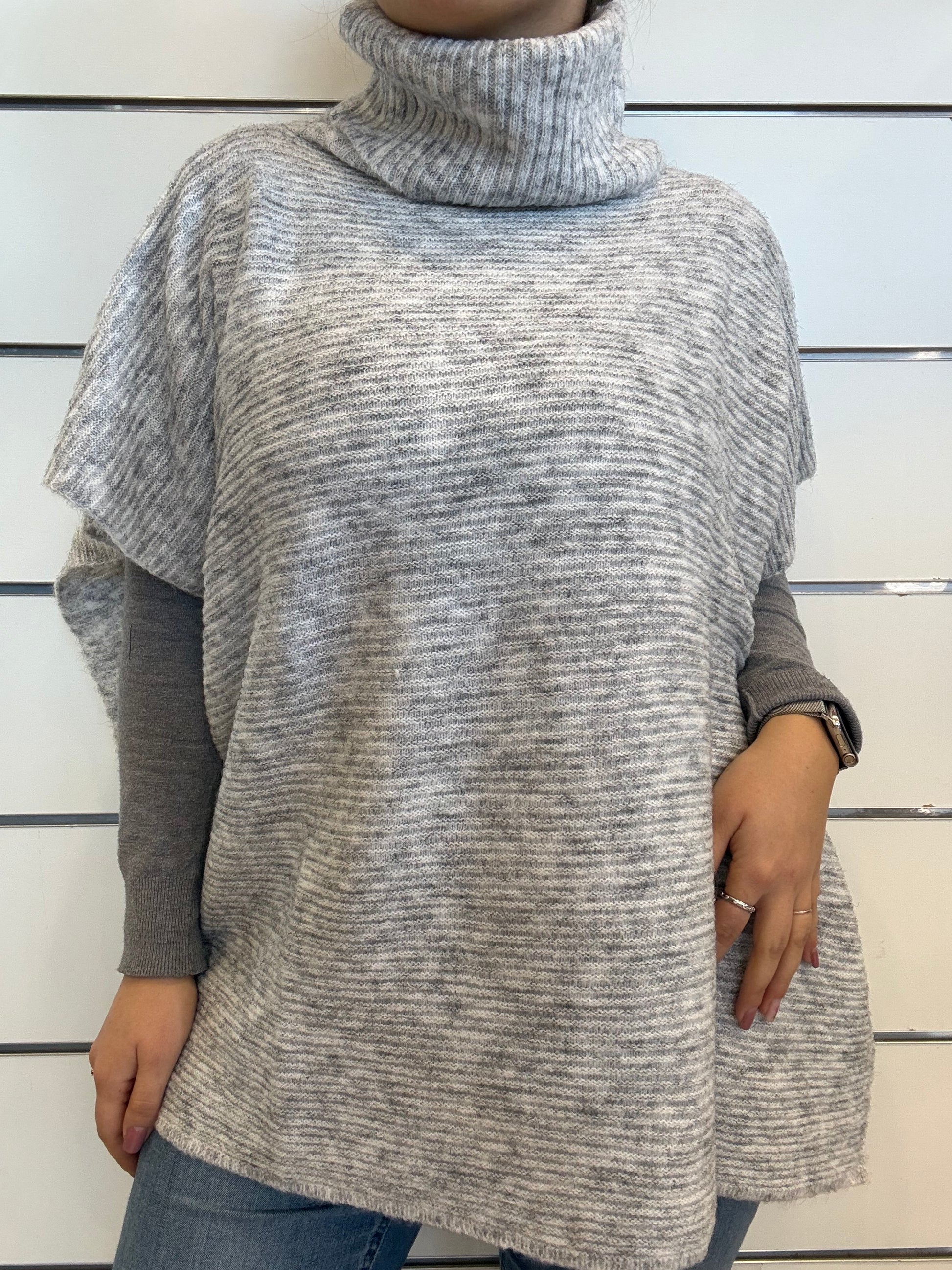 Mantella a righe grigio-bianco, calda e avvolgente, con collo alto e lavorazione melangiata che unisce il bianco a sottili filati grigi. Senza maniche e completamente aperta sui lati, si indossa facilmente dalla testa ed è perfetta anche sopra cappotti e giacche. Realizzata in una morbida e resistente maglia (80% poliestere, 11% acrilico, 8% lana, 3% elastan), è l’ideale per aggiungere stile e calore ai look quotidiani.