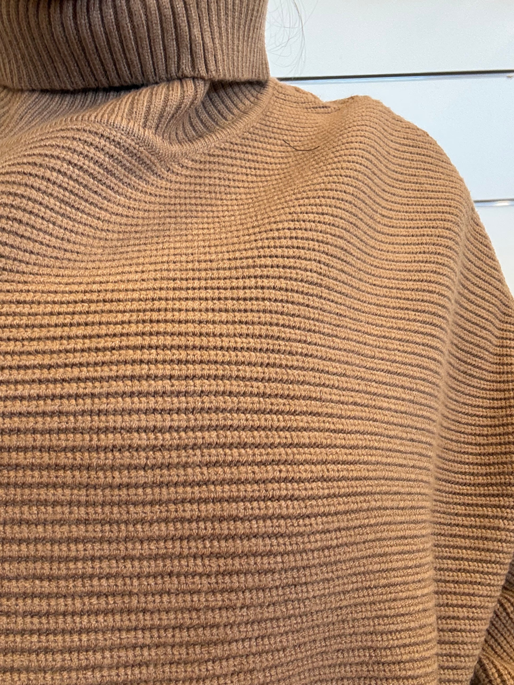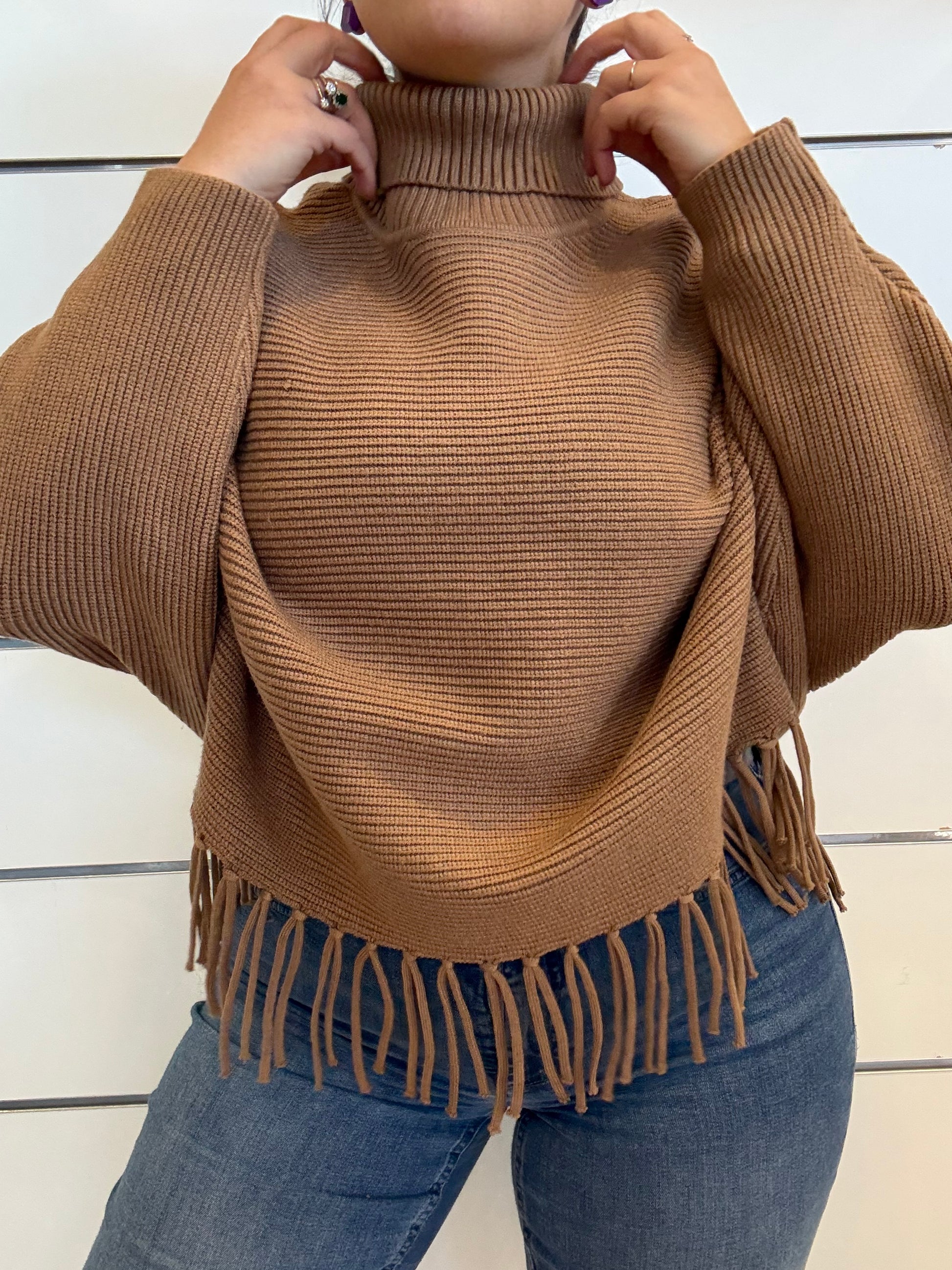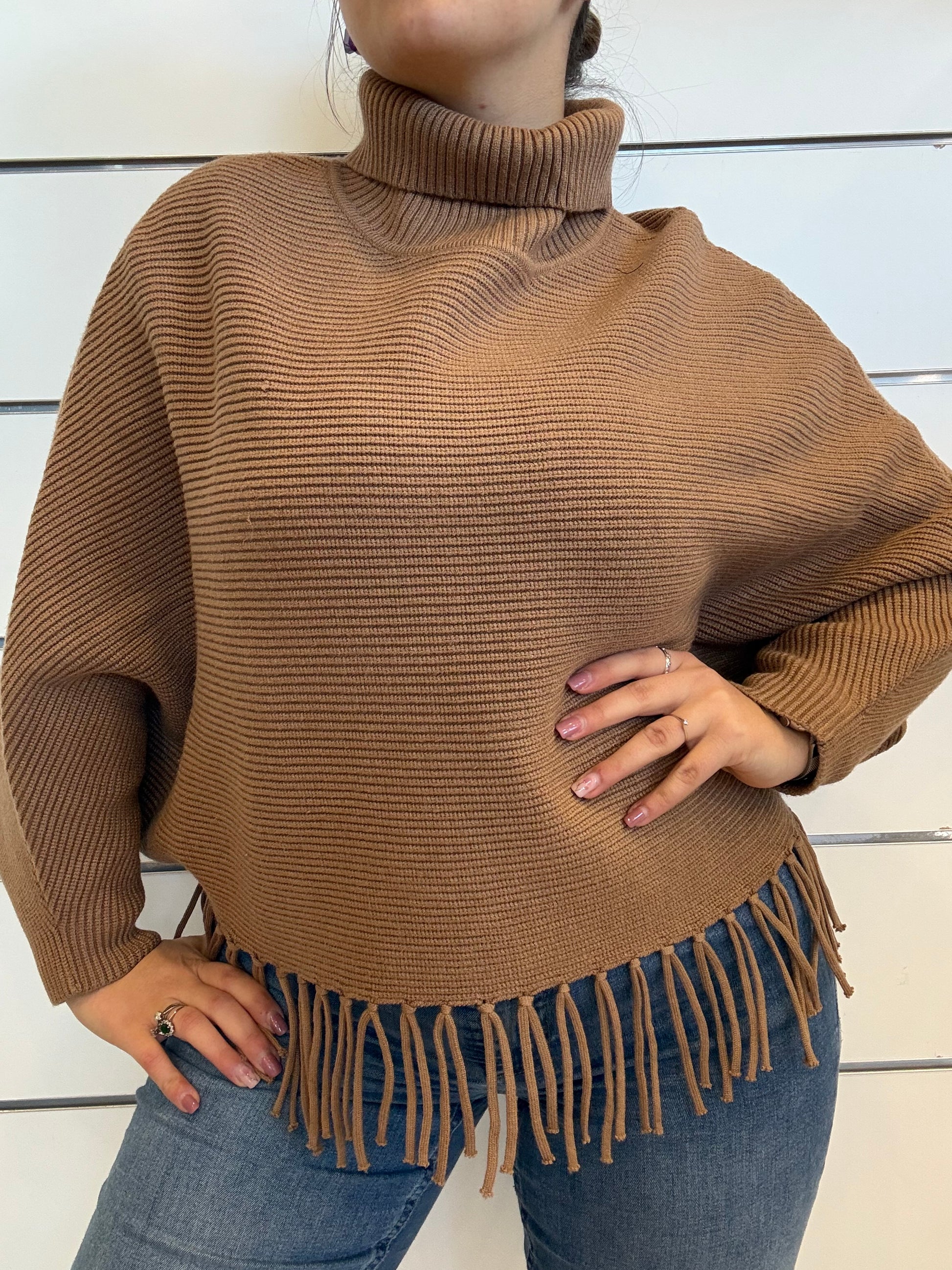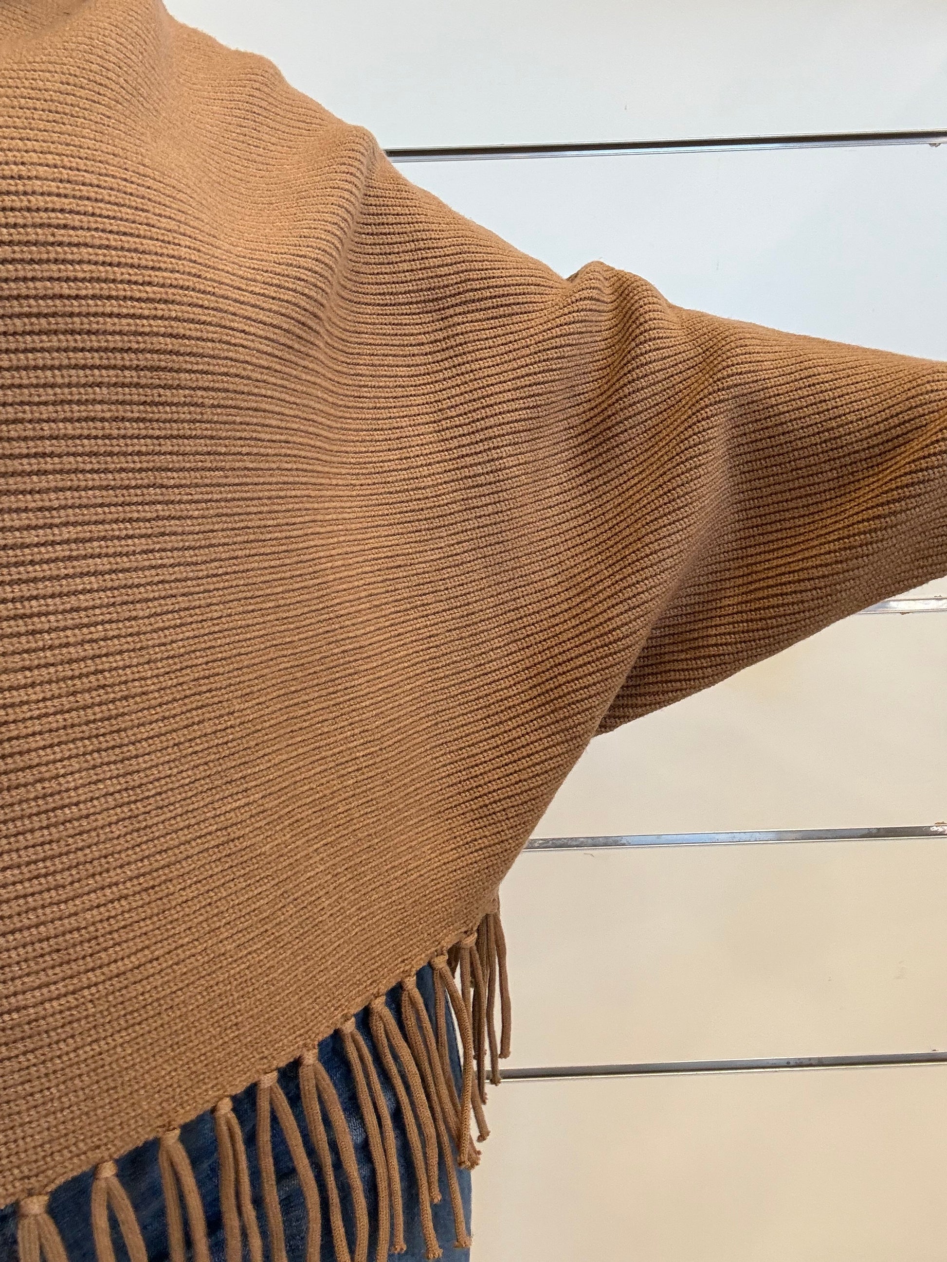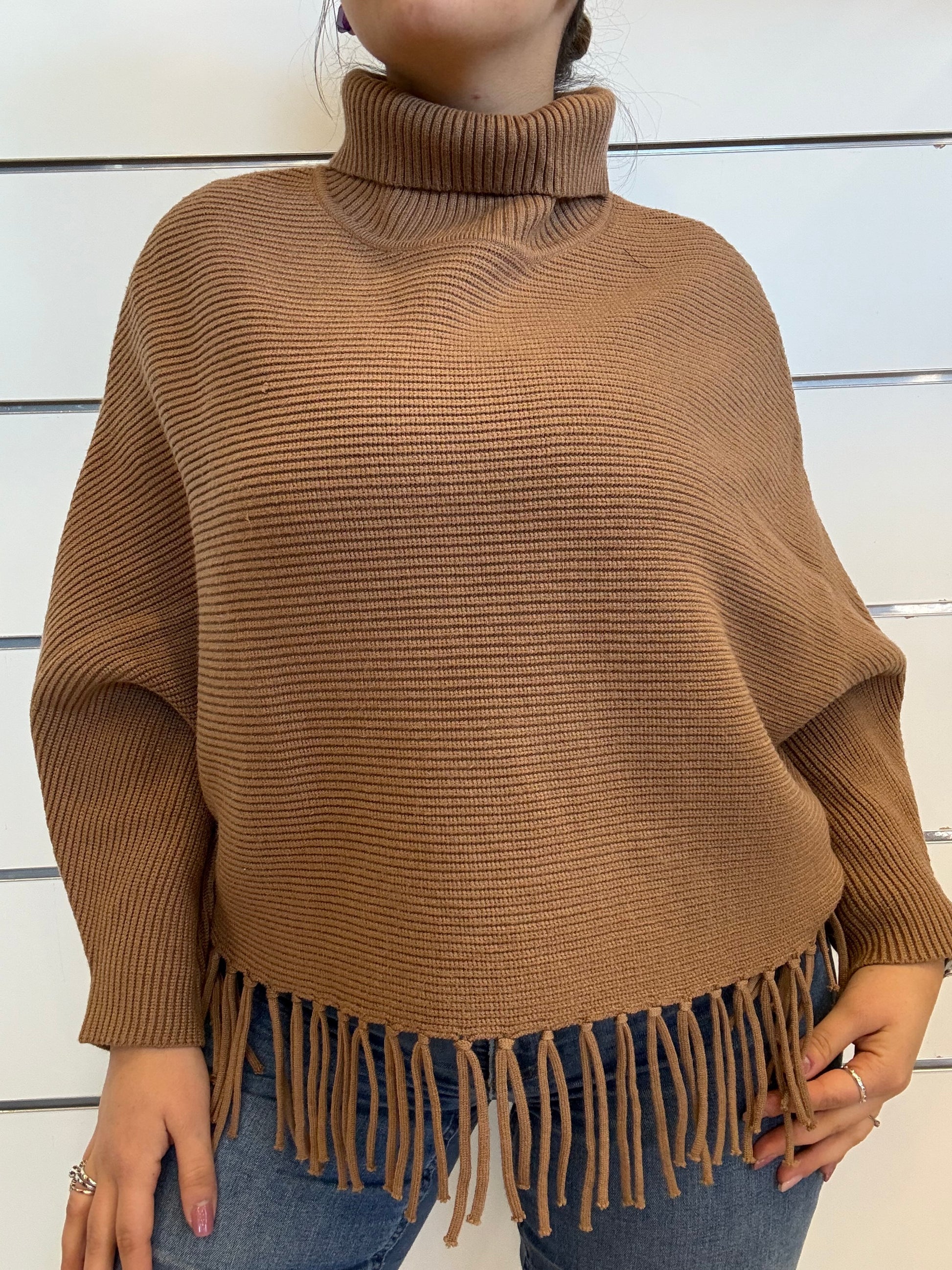 Mantella con maniche color biscotto, calda e avvolgente, caratterizzata da righe orizzontali a costine e da un elegante collo alto. Il fondo è arricchito da frange morbide che donano movimento e un tocco boho-chic. Realizzata in una maglia soffice e confortevole (50% viscosa, 28% poliestere, 22% poliamide), è perfetta per completare i look autunnali e invernali con stile.
