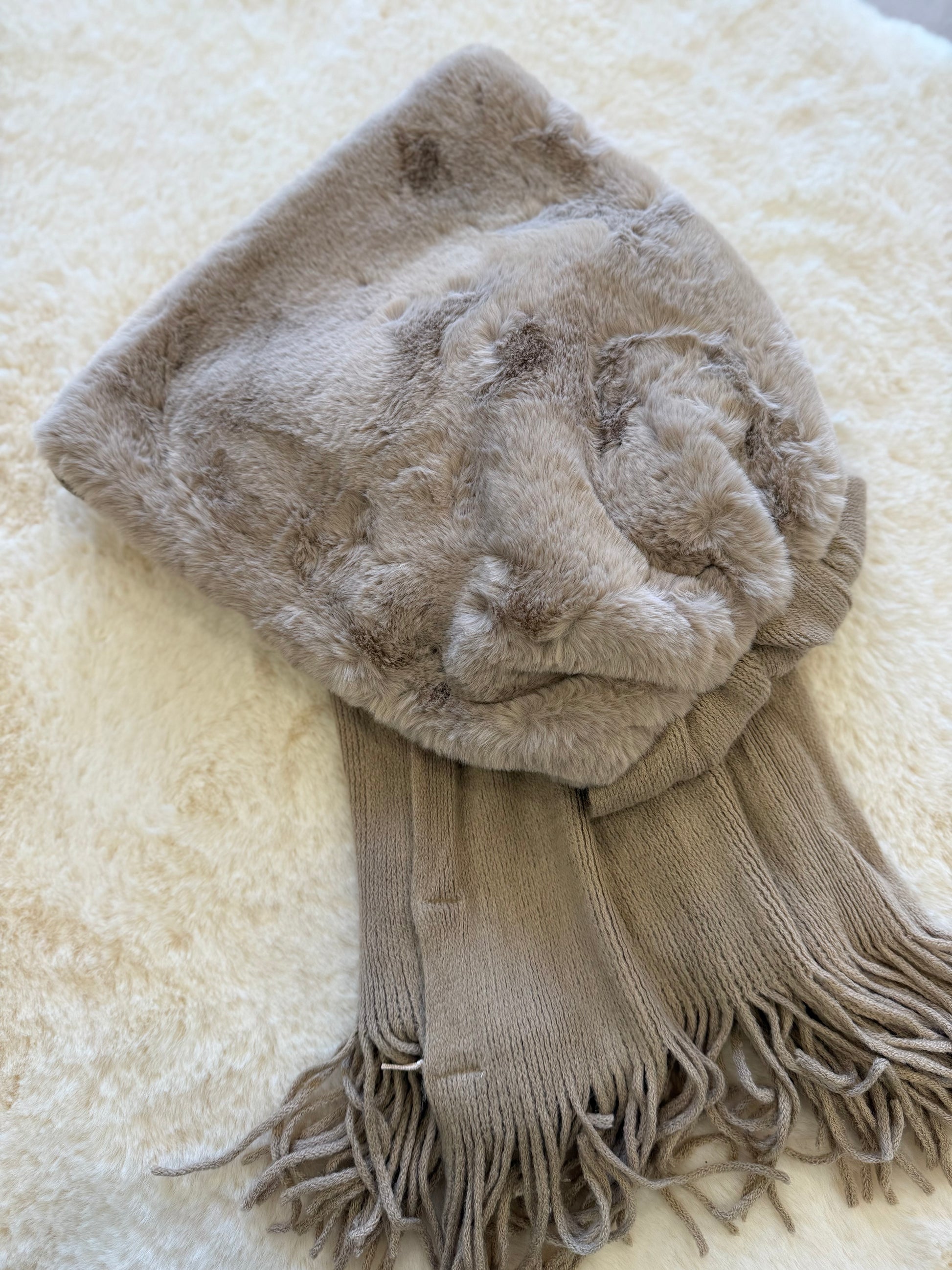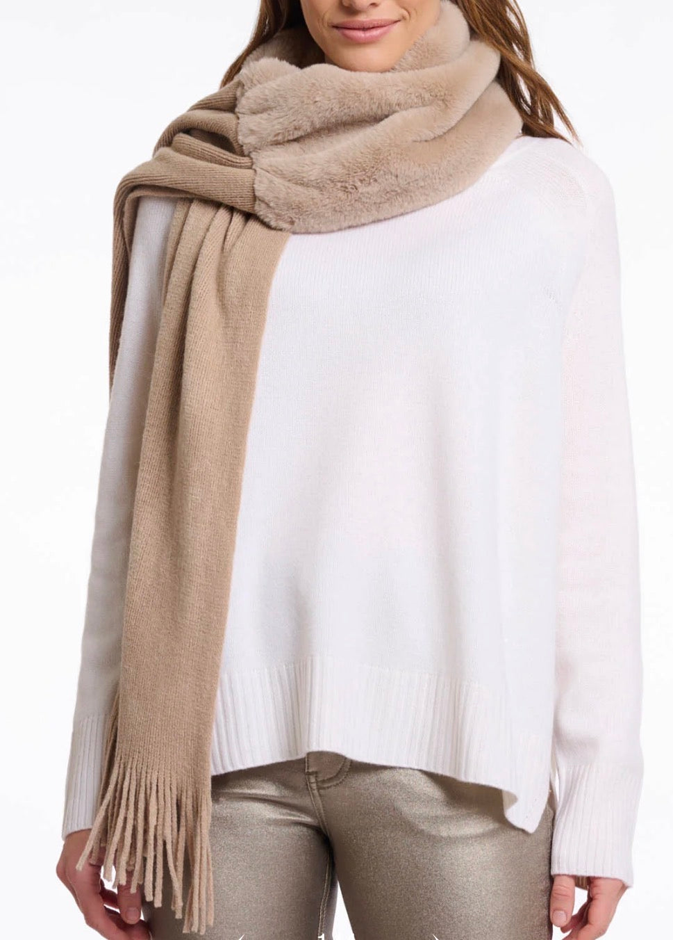 Sciarpa intrecciata tono su tono. Questa sciarpa presenta dettagli in pelliccia sintetica, ampie frange alle estremità e una sensazione di morbidezza estrema.