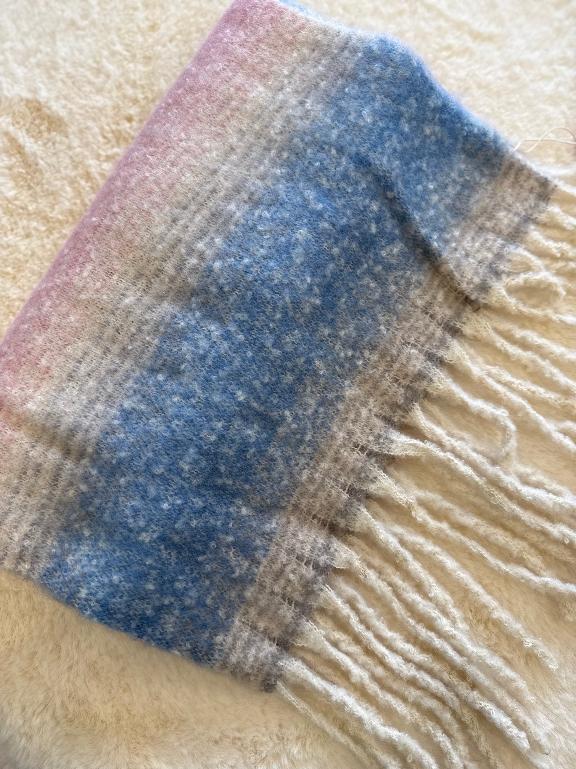 Morbida e luminosa, nei toni panna,azzurro e rosa. Elegante e versatile, dona un tocco di brillantezza ai tuoi outfit quotidiani.